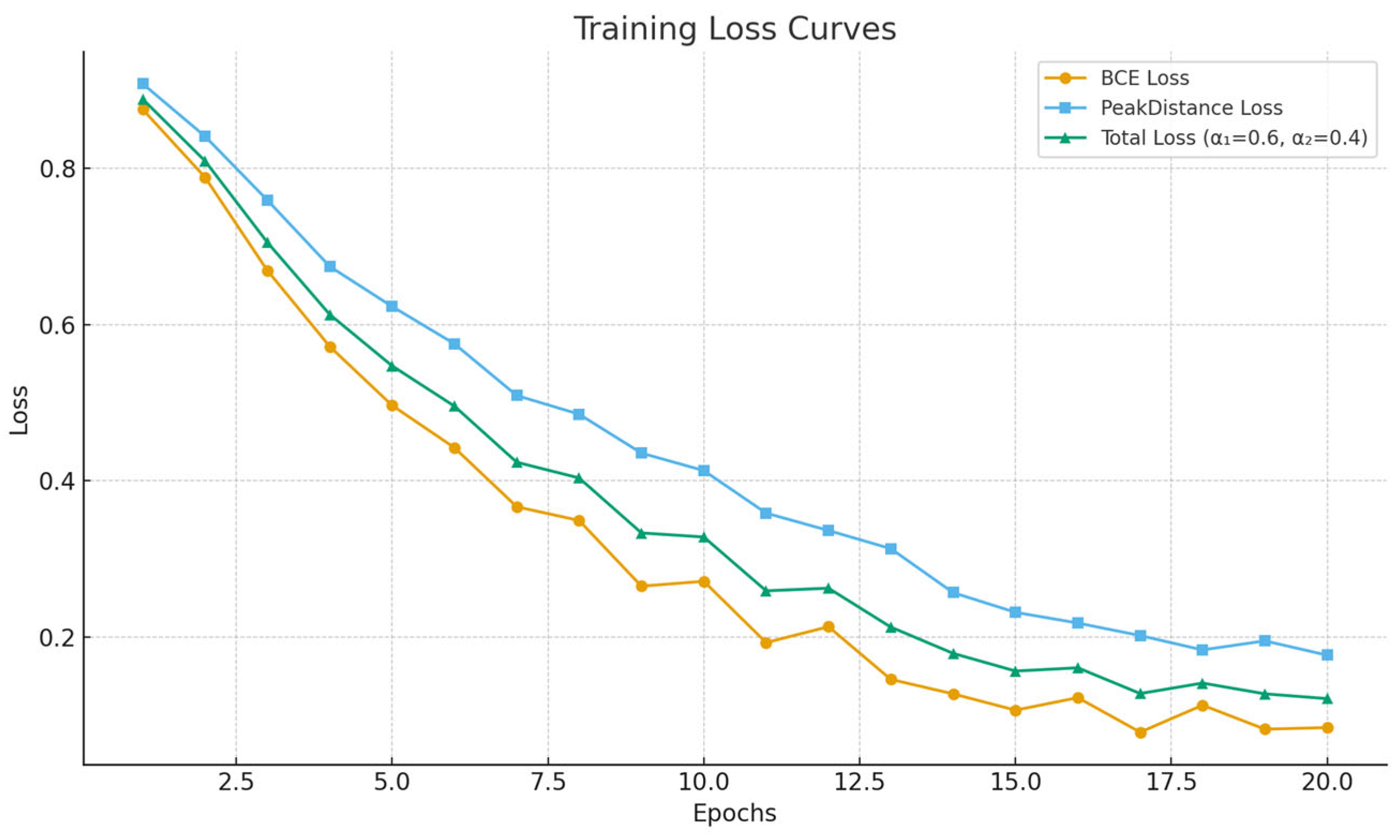 The proposed (Equation (19)) is formally defined as the average minimal temporal deviation between each reference peak and its nearest predicted counterpart . This formulation ensures that the loss is (1) non-negative, with if and only if all predicted peaks perfectly coincide with the ground-truth positions; (2) monotonically increasing with the temporal displacement , guaranteeing that larger localization errors contribute proportionally higher penalties; and (3) differentiable almost everywhere, allowing gradient-based optimization in end-to-end neural training. Compared to standard amplitude-based losses such as Binary Cross-Entropy or Mean-Squared Error (MSE), which only penalize classification errors at the sample level, measures temporal accuracy. By minimizing the spatial–temporal misalignment between predicted and true peaks, it provides a direct optimization target for localization tasks.