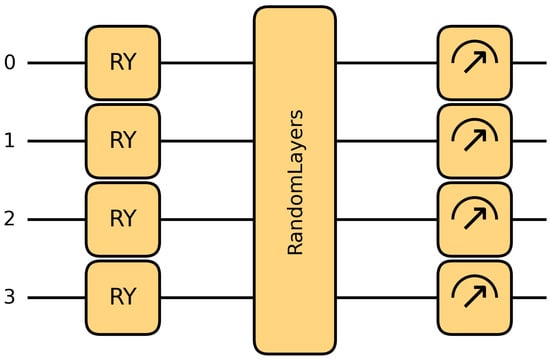 In addition to this architectural integration, the quantum layer incorporated quantum data transformations that simulate the behavior of quanvolutional filters [26]. The underlying idea was that the randomness and noise introduced by quantum operations could serve as a non-classical data augmentation technique, enriching the model’s representational diversity. This approach is particularly relevant for near-term noisy intermediate-scale quantum (NISQ) devices, where limited qubit counts and decoherence can be exploited constructively rather than treated as limitations. In this study, we employed combinations of Y-axis and X-axis qubit rotation gates, implemented in the Pennylane framework. Each input feature was multiplied by and used as a rotation angle for the corresponding qubit, effectively embedding the normalized data into the quantum state space. The Ry and Rx gates performed rotations of single qubits around the Y and X axes of the Bloch sphere, respectively, creating transformations that are both nonlinear and inherently stochastic.