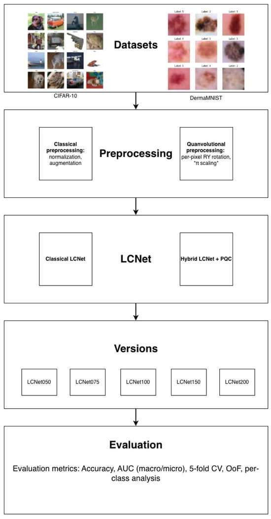 The rigorous workflow was implemented to ensure fair and robust comparison between classical and hybrid models. Training and validation were conducted using stratified 5-fold cross-validation (CV). After five folds, OoF predictions were aggregated and used to compute final performance metrics, including overall accuracy, macro- and micro-averaged AUC, and per-class accuracy. Confusion matrices were also constructed to assess class-specific performance. This workflow was applied consistently to both CIFAR-10 and DermaMNIST, ensuring methodological comparability between experiments on general-purpose and medical datasets. This strategy provided several advantages. First, it mitigated overfitting by ensuring that evaluation was always performed on unseen data. Second, stratification preserved class balance across folds, which is essential for multiclass tasks such as CIFAR-10. Third, it enabled aggregation of predictions across all folds into a complete set of out-of-fold (OoF) predictions, which served as the basis for computing unbiased performance metrics. During training, models were optimized using stochastic gradient descent with appropriate learning rate scheduling. At the end of each epoch, validation accuracy, AUC, and loss were recorded. After five folds, OoF predictions were aggregated and used to compute final performance metrics, including overall accuracy, macro- and micro-averaged AUC, and per-class accuracy. Confusion matrices were also constructed to assess class-specific performance. To ensure reproducibility, the following configuration was applied consistently across all folds. The experiments used quantum-augmented inputs consisting of the original RGB channels and four additional quantum-generated channels (QC5 configuration, total channels). Each experiment was trained using 6-fold cross-validation, with a batch size of 64, and optimized using the Adam optimizer with a learning rate of . Training was conducted for 10 epochs without early stopping or other adaptive termination criteria. All random seeds were fixed to 42 for NumPy 2.0.2, TensorFlow 2.15.1, and Python 3.10 to ensure deterministic behavior. The implementation used TensorFlow in a single-replica Kaggle environment without TPU acceleration. Due to the preprocessing overhead introduced by the generation of quantum-enhanced channels, a direct wall-clock time comparison with purely classical baselines was not performed. This preprocessing step introduces additional latency that is independent of model optimization, and thus not representative of training efficiency differences between classical and hybrid architectures.