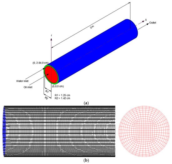 As a result, the axial pressure drop along the pipeline decreases. By using this technology instead of traditional transportation methods, the energy required to transport a given mass of oil can be significantly reduced. The CAF represents the flow through a horizontal pipe, where a high-viscosity liquid (heavy oil) is surrounded by a low-viscosity annular layer of water, as illustrated in Figure 1a,b. The present study examines the behavior of CAF using computational fluid dynamics (CFD) based on the Large Eddy Simulation (LES) model [10,11,12].