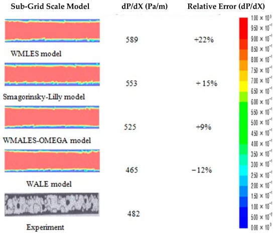Figure 3 presents the predictions of the oil mass fraction obtained from various SGS models, alongside the corresponding experimental results reported [1]. All SGS models successfully reproduce the core annular flow (CAF) pattern. Among them, the WMALES S–Omega model provides the most accurate prediction of the pressure gradient. The experimental flow visualization, also taken from [1], may include some level of deformation, as the original study does not specify otherwise. In the experiments, black represents water, while white with dots indicates oil. In the LES simulations, oil is represented in red and water in blue. The figure also compares the pressure gradients predicted by the different SGS models with the experimental measurements, including the percentage differences.