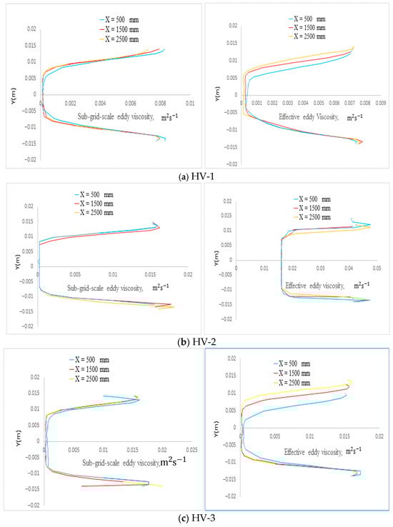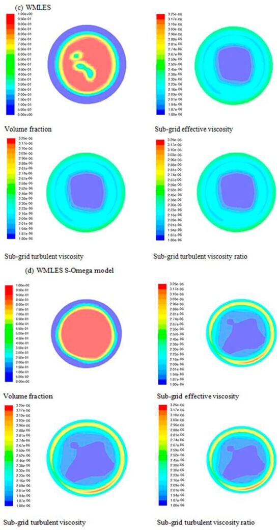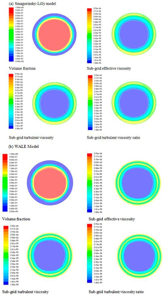 Figure 7b,c illustrates the oil–water interface region. Due to the no-slip condition at the wall and the viscosity of the oil phase, turbulence intensity is low both at the pipe wall and along the oil–water interface. In contrast, the highest sub-grid-scale (SGS) eddy viscosity is observed in the annular water layer near the pipe wall. Furthermore, an increase in the water flow rate leads to higher turbulence intensity within the annular water layer, as evidenced by the comparison between Figure 7a,b.