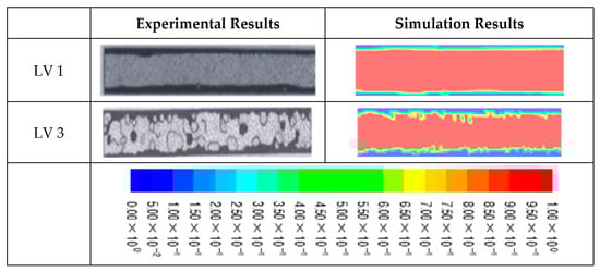 The flow conditions for the simulations LV-1, LV-2, and LV-3, which correspond to the experimental conditions reported by [1], are summarized in Table 2. In their experiment [1] employed water and low-viscosity oil (0.0168 Pa·s) to generate a core annular flow (CAF). Figure 5 compares the simulation results with the experimental observations, showing qualitative agreement in the flow patterns. In both the experiments and simulations, the oil–water interface in LV-1 is nearly parallel to the pipe wall and remains essentially non-wavy. For LV-3, both experimental and computational results indicate the presence of a wavy interface.