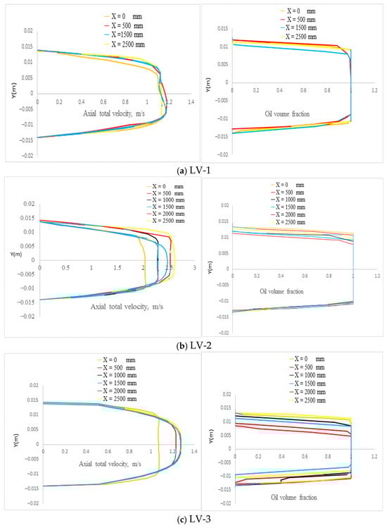The core annular flow (CAF) predicted by LES using the Smagorinsky–Lilly SGS model shows good agreement with the experimental results reported by [1]. Accordingly, this configuration was used to investigate the cross-sectional flow characteristics of CAF. For low-viscosity CAF, the axial velocity profiles and oil volume fraction distributions at different axial locations on the meridional plane are presented in Figure 6. Figure 6a illustrates a laminar flow state and a typical CAF, where the inflow volume fraction does not evolve significantly along the axial direction. The waviness of the phase interface, indicative of a turbulent flow state, is reflected in the oil volume fraction profiles shown in Figure 6b,c.