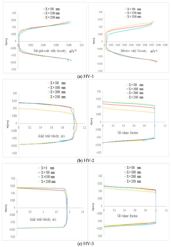 The LES predictions of the oil volume fraction, axial velocity profiles, and radial velocity distributions at various axial locations for heavy-oil CAF are presented in Figure 8a–c. The effects of increasing inflow momentum from HV-1 to HV-3, as well as the influence of water density from HV-1 to HV-2, are illustrated in these figures. The corresponding flow conditions are summarized in Table 3.