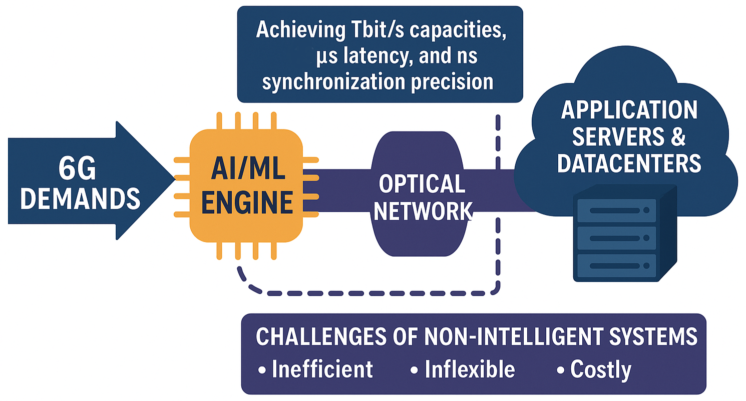 The need to achieve terabit-per-second (Tbps) air-interface rates, combined with stable microsecond (µs)-level latencies, reflects a fundamental shift in the focus of network engineering. While 5G concentrated heavily on enhancing radio interface capabilities (e.g., Massive MIMO, mmWave), 6G shifts the critical bottleneck towards the transport and computing infrastructure. Tbps radio-frequency (RF) capabilities and microsecond-level latency become ineffective if the fibre cannot deliver that volume of data to Edge Computing for real-time processing. This will fundamentally redefine the role of the optical transport network, which can no longer be regarded as a passive “bit pipe” but rather as an active and integrated platform for communication, computation, and, potentially, sensing.