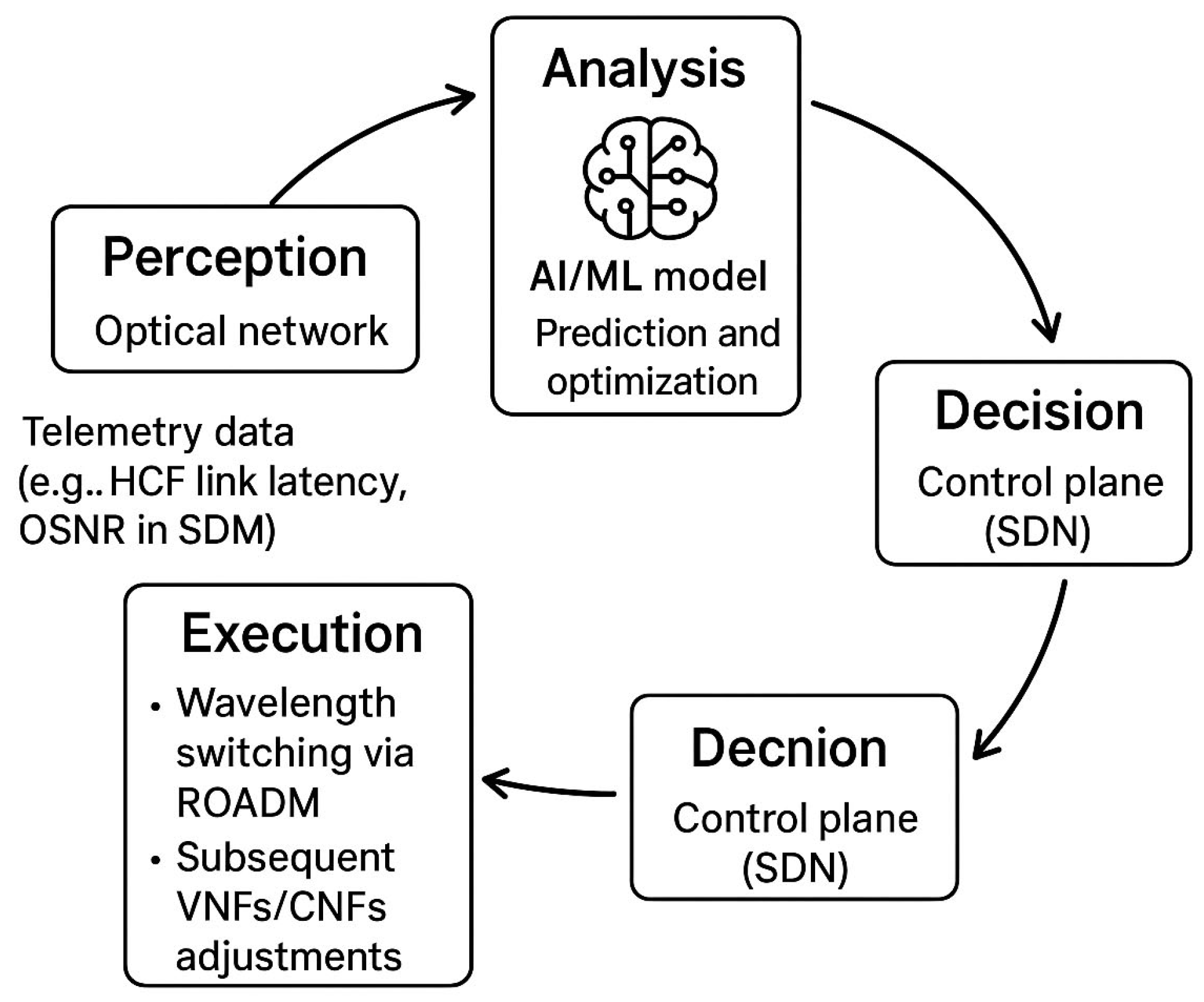 • AI-Native Integration: Unlike 5G, where AI is often introduced as an overlay layer, the 6G architecture must be conceived from the ground up to integrate AI natively (AI-Native) [10]. This means that data collection, AI processing, and ML model execution capabilities must be embedded within optical network elements and management systems, enabling intelligent optimisation, advanced automation, and the creation of AI-driven services.