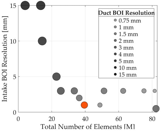 The effect of the various meshing parameters investigated as part of the grid independence study on the total number of elements (computational cost) is visualized in the grid parameter map in Figure 3. In this chart, the x-axis represents the total number of elements, while the y-axis shows the intake BOI resolution, which is critical for capturing shock structures. The color of the bubbles encodes the duct BOI resolution, and their size represents the surface (intake surface) mesh sizing. The chart quantitatively demonstrates that refining the resolution in the BOI regions (a smaller mm value) significantly increases the total number of elements. The reference grid, highlighted in orange with approximately 39 million elements, was selected based on the observation of the pressure ratio shown in Figure 4.