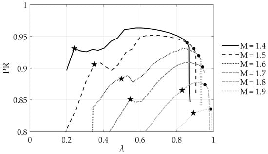The operational performance map of the inlet is presented for M∞ ranging from 1.4 to 1.9. In Figure 8, PR is plotted against the flow parameter λ with each line style corresponding to a specific Mach number. This map is crucial for stability assessment, as two critical performance boundaries are explicitly marked on each curve: the star (★) marker indicates the ‘buzz onset’ (the last stable operating point), while the dot (●) marker signifies the ‘throat choking’ condition (the maximum flow or unstart limit). A key trend observed is that as the Mach number increases, the overall peak PR achieved by the inlet tends to decrease.