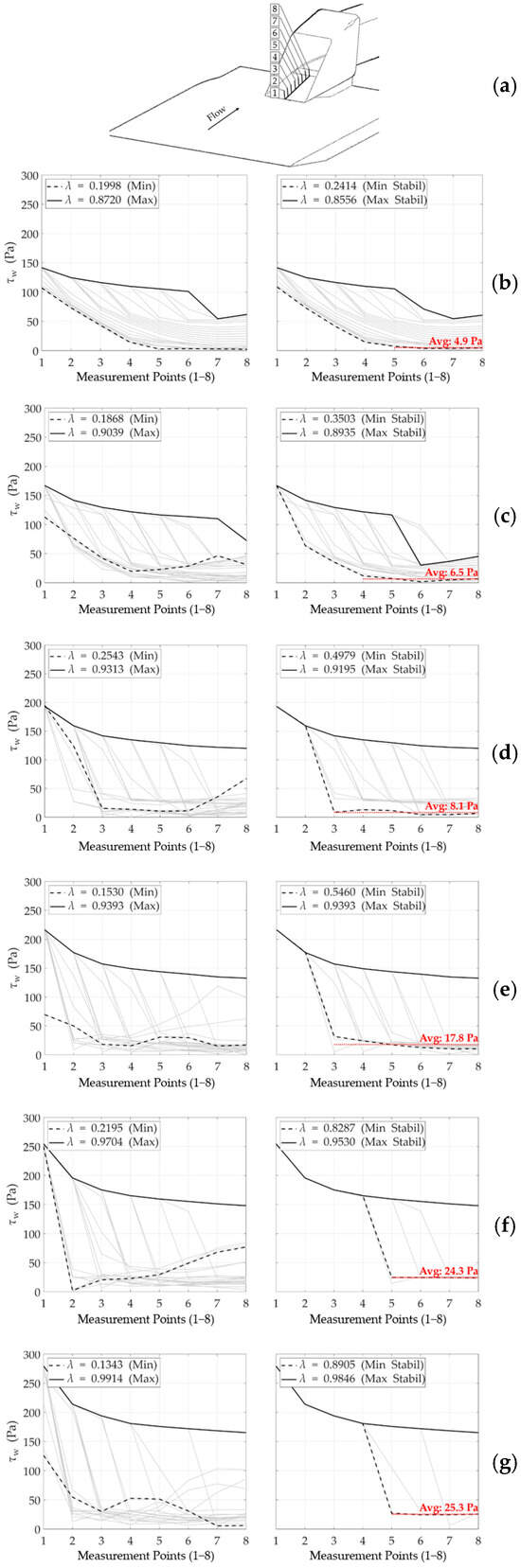 Comparison of wall shear stress (a) at 8 discrete data points along a line on the compression surface; at different freestream Mach numbers for different flow ratios: (b) M∞ = 1.4, (c) M∞ = 1.5, and (d) M∞ = 1.6, (e) M∞ = 1.7, (f) M∞ = 1.8, and (g) M∞ = 1.9.