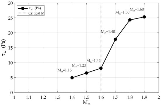 Wall shear stress versus freestream Mach number. Each data point is with the corresponding Mach number upstream of the normal shock. The vertical dotted line indicates the ‘Critical Mach’ at Mn = 1.32 (corresponding to M∞ = 1.6).