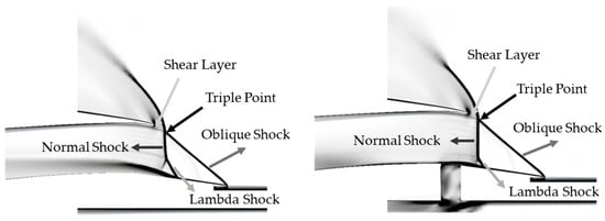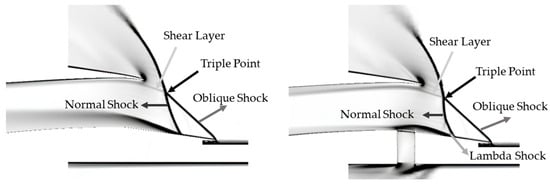 Figure 16 displays the performance characteristics for the inlet at M∞ = 1.9, comparing the WB (solid line) and WOB (dashed line) configurations. Figure 17 provides the physical explanation for the performance difference observed at Mach 1.9, visualizing the flow structure at specific operating points for both configurations. The WOB condition (left, at λ = 0.942) visualizes the baseline SBLI. A primary normal shock interacts with the boundary layer, leading to the formation of a triple point, an oblique shock, and a subsequent shear layer. A small Lambda Shock structure is also visible at the foot, indicating the presence of flow separation. This separation is the source of the pressure losses and instability documented for the WOB case in Figure 16. The WB condition (right, at λ = 0.951) demonstrates the effect of bleed. The bleed, positioned directly under the interaction, actively removes the low-energy boundary layer. This suction modifies the SBLI, promoting a more stable and pronounced Lambda Shock structure at the foot. By controlling the boundary layer in this manner, the bleed system prevents large-scale separation, anchors the terminal shock, and is the direct cause of the enhanced PR and stability documented for the WB configuration in Figure 16.