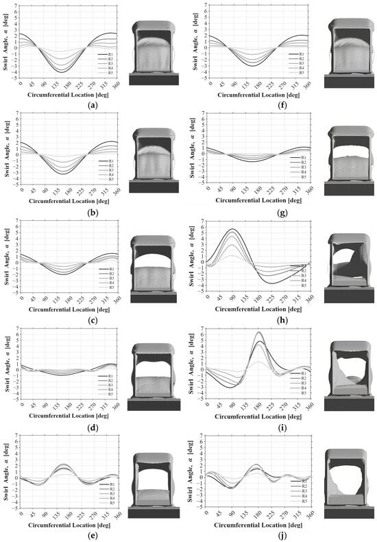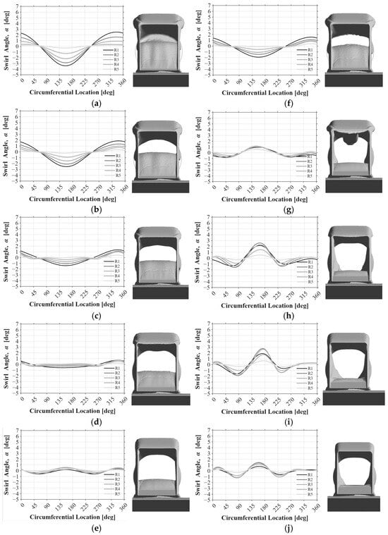 3.6. Circumferential Swirl Angle Distributions