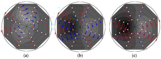 Comparison of AIP swirl angle distributions for (a) M∞ = 1.6, (b) M∞ = 1.8, and (c) M∞ = 1.9 at a fixed flow ratio (λ = 0.36). Each subplot presents the WOB swirl angle distribution via grayscale contours and illustrates the swirl magnitude and direction via overlaid vectors. The vector comparison highlights the bleed system’s control authority: blue vectors indicate the WOB swirl field, while red vectors indicate the WB swirl field.