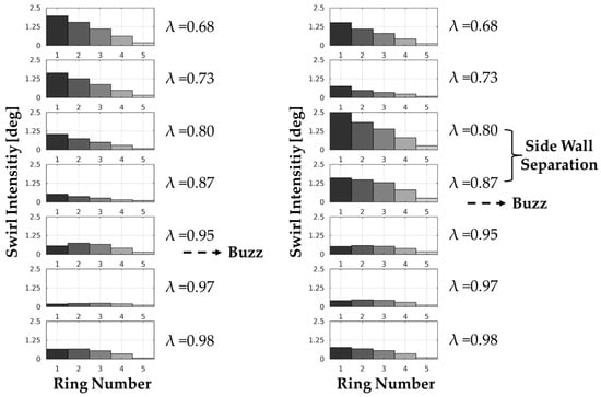 Figure 24 depicts the radially resolved SI features at 1.8, over a λ range of 0.65 to 0.96. In the WOB arrangement, the SI is moderately high at lower λ values (0.65 to 0.86), peaking at 1.5 degrees in the inner rings (R1, R2) and decreasing radially outwards. Similarly to the Mach 1.6 scenario, as the λ increases beyond the buzz initiation point (shown near λ = 0.86), there is a noticeable decline in intensity throughout all rings. In contrast, the bleed system produces a significant reduction in SI throughout all rings and λ, with values typically remaining below 1 degree. The radial distribution is likewise much more uniform than in the WOB example. Surprisingly, despite the overall low intensity levels, there is a “Twin Vortex” structure matching λ = 0.80 and 0.86 in the WB data. This shows that, while the bleed system effectively reduces the overall amplitude of the swirl, residual structured flow structures, maybe corresponding with modest wavy patterns in swirl angle distributions, may exist under certain operating conditions even when the bleed system is functioning.