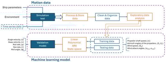 Figure 1, integrates simulation-based data generation, systematic preprocessing, and machine learning-driven system identification to predict the maneuverability of a 4-DoF river combat patrol vessel. The process begins with the execution of high-fidelity simulation tests that incorporate both ship parameters (propeller shaft speed, propeller azimuth angles) and environmental factors (wind speed and direction, represented through attack angles). These simulations produced 125 h of time-series data, of which 29 h corresponded to out-of-distribution (OOD) scenarios, enabling evaluation of model generalization.