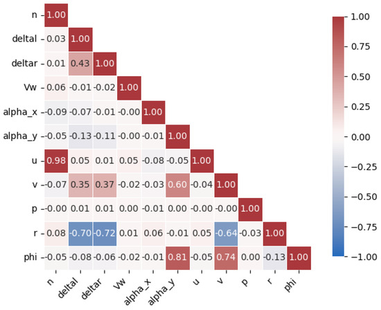 The generated data were then processed, stored, and cleaned and organized, including the identification of missing or duplicated values, normalization of variable ranges, and division into training, testing, validation, and OOD subsets. The exploratory data analysis was then performed to characterize the correlations among the variables and to assess the dynamics of the ship under routine and OOD conditions. This stage laid the foundation for selecting appropriate modeling strategies and highlighted the influence of propulsion and environmental inputs on the vessel’s dynamic response.