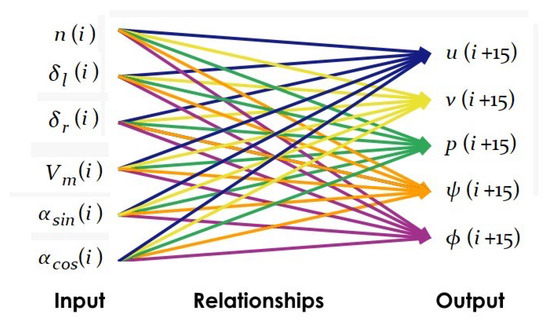 The ARX model is a well-established data-driven technique in system identification, widely used for time-series forecasting and control design. Unlike purely regression-based approaches, the ARX framework explicitly incorporates temporal dependencies by linking the present value of each output variable not only to contemporaneous inputs but also to its past values. This recursive structure enables the model to capture short-term memory effects and dynamic correlations between successive state of the vessel, making it particularly suitable for predicting ship maneuverability under evolving conditions. In the context of this study, the ARX formulation was applied to all five output variables (i.e., u, v, p, r, and ) using propulsion and wind-related variables as exogenous inputs. Parameter estimation was performed via least-squares optimization, ensuring computational efficiency while preserving the model’s interpretability.