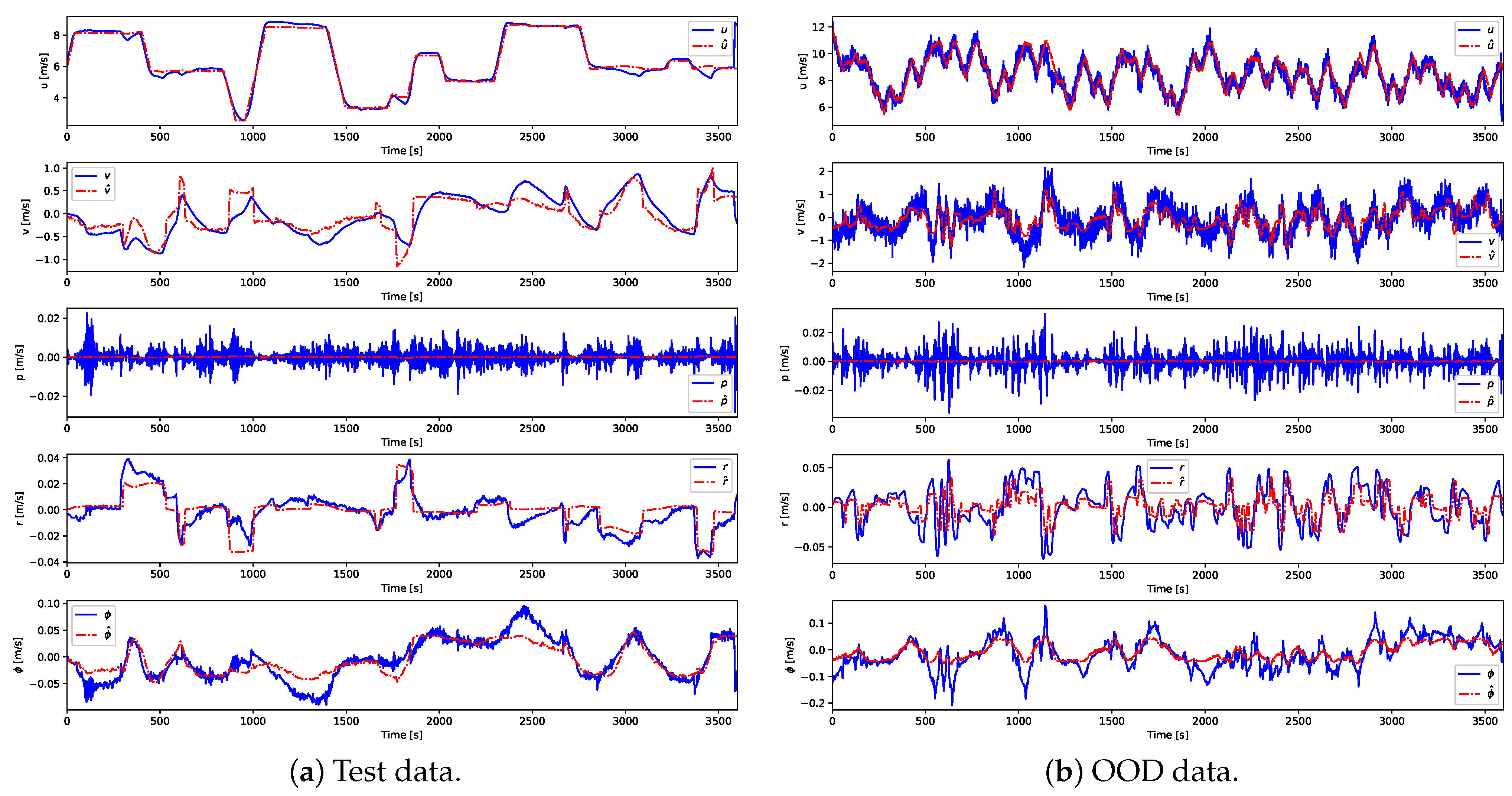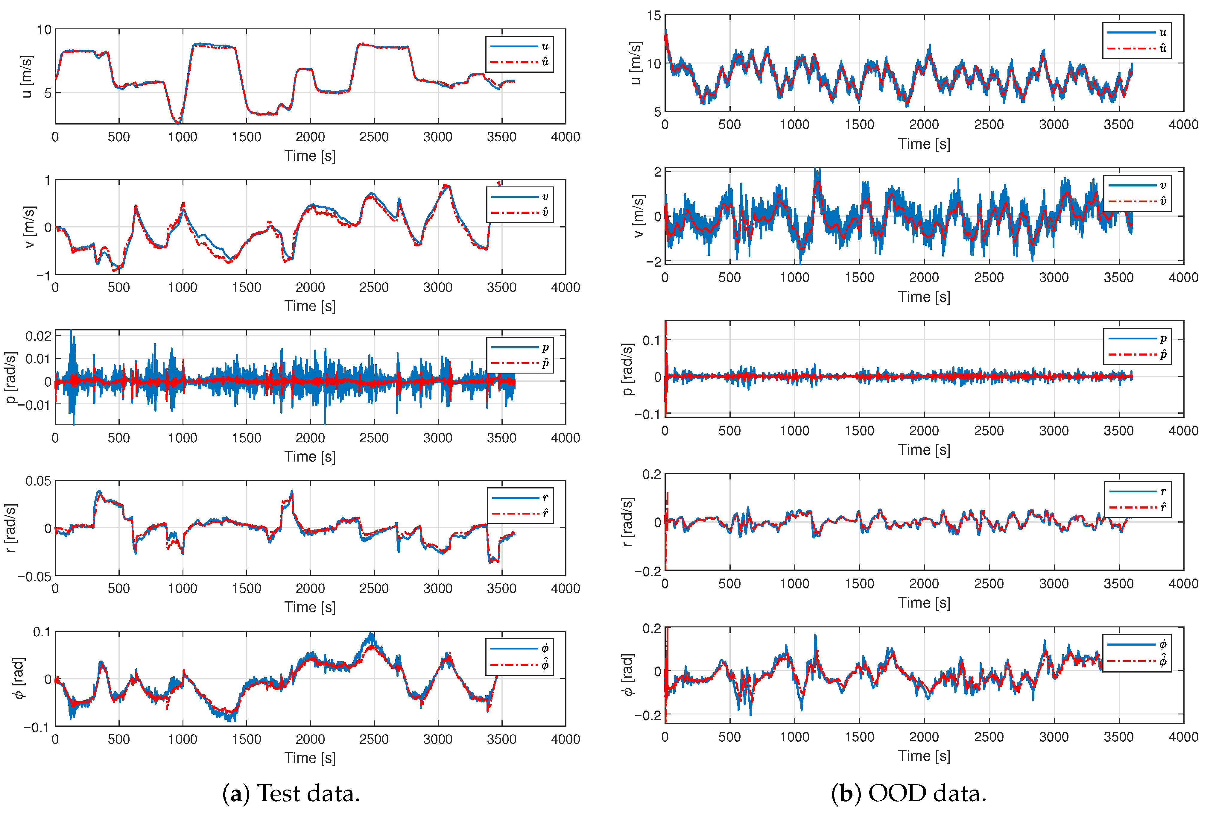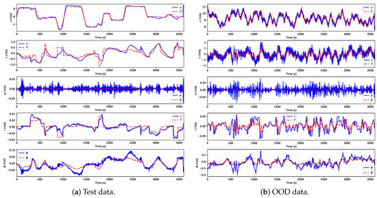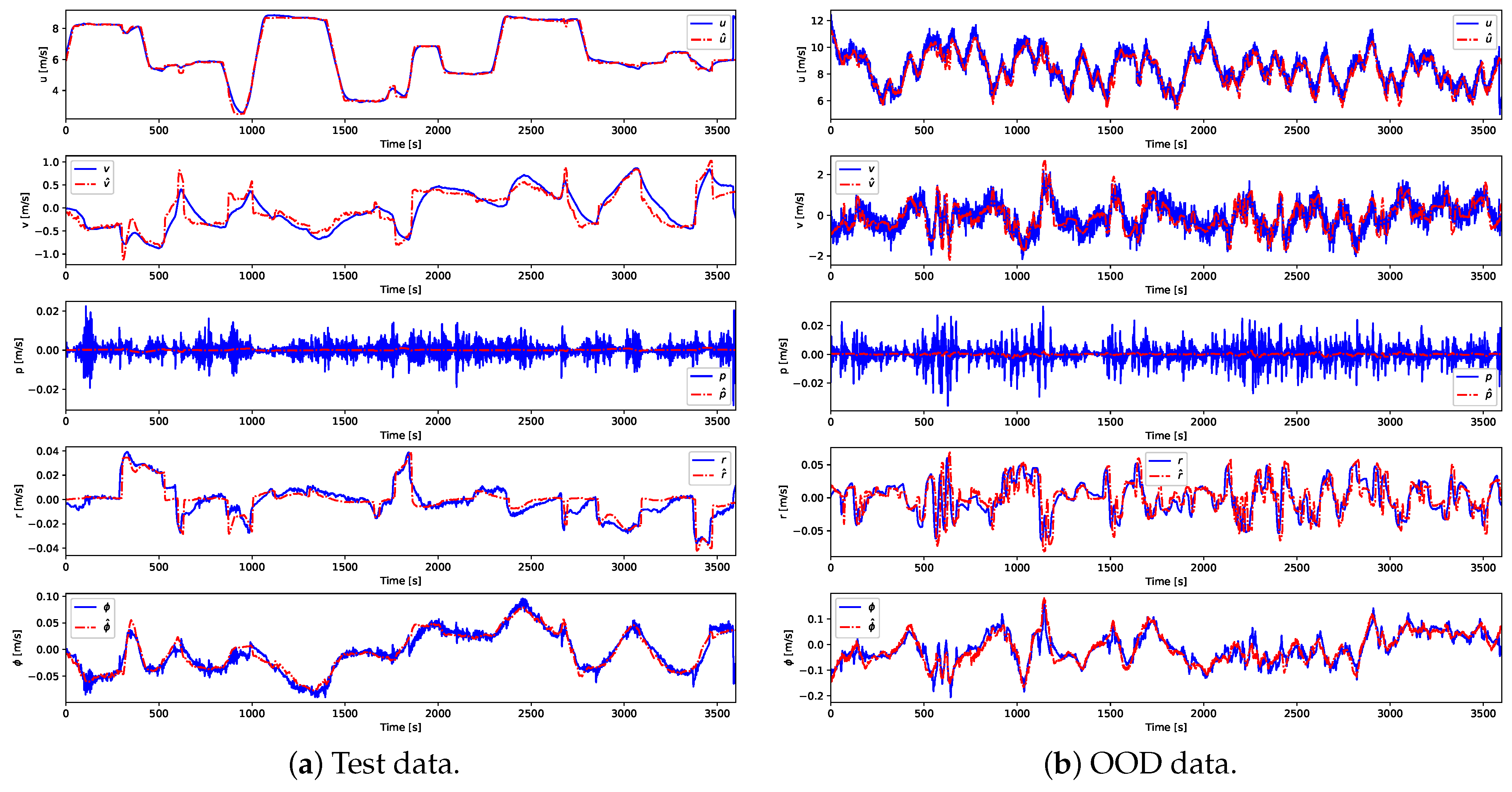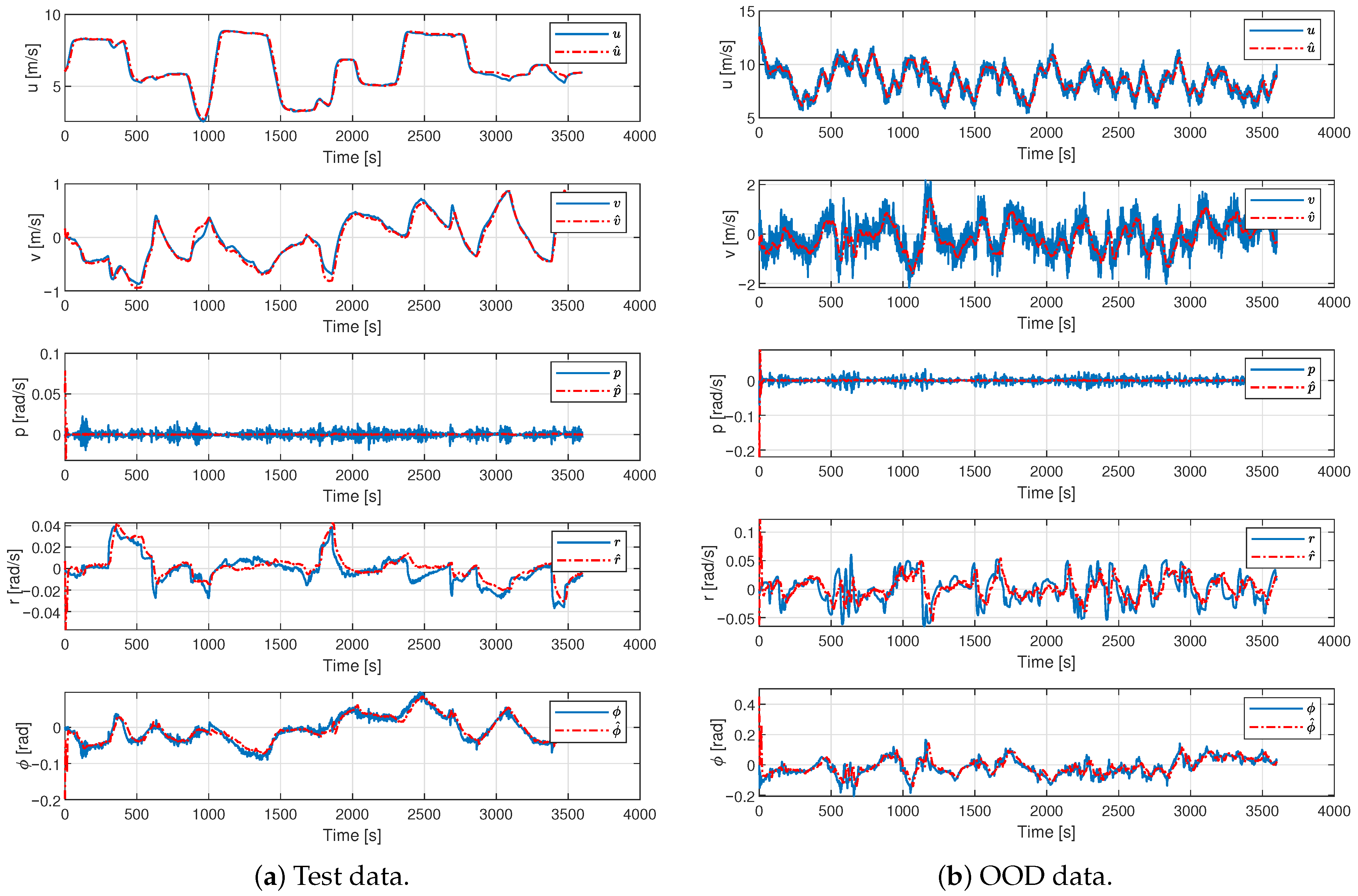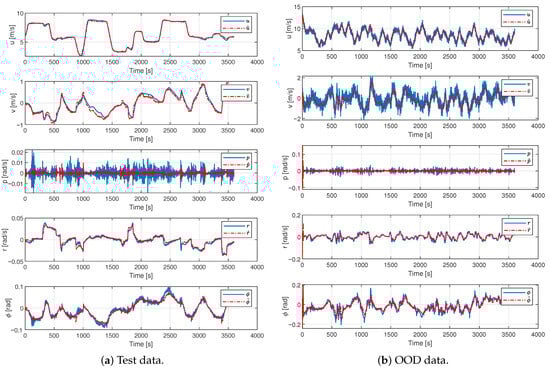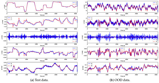 Figure 8a, the predicted trajectories closely match the measured responses for all variables, confirming the adequacy of the recursive formulation in capturing the dynamics of the vessel during standard maneuvers. Under OOD conditions (