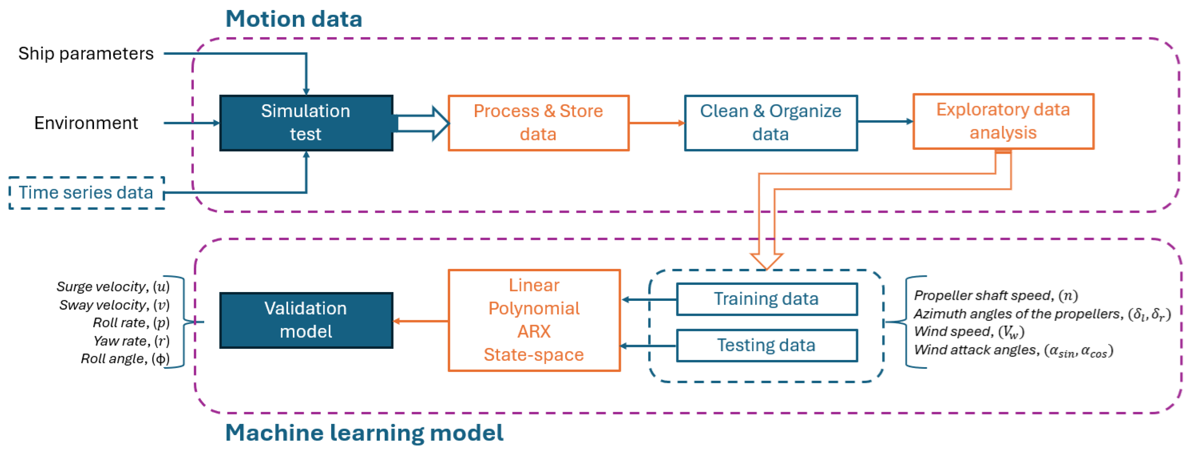 The methodological framework of this study was designed to integrate data-driven modeling techniques with the principles of system identification to capture the maneuverability characteristics of a river patrol vessel under realistic operating conditions. This section describes the dataset employed, including its composition, preprocessing, and division into training, validation, and OOD subsets. Then it outlines the modeling strategies implemented, namely linear regression, polynomial regression, state-space representation, and ARX models with AR inputs. Each method was selected to provide a balance between interpretability and predictive accuracy, enabling a rigorous evaluation of their capacity to forecast vessel dynamics across multiple degrees of freedom. The subsequent subsections present the dataset structure, the modeling approaches, and the validation procedures used to assess model performance.