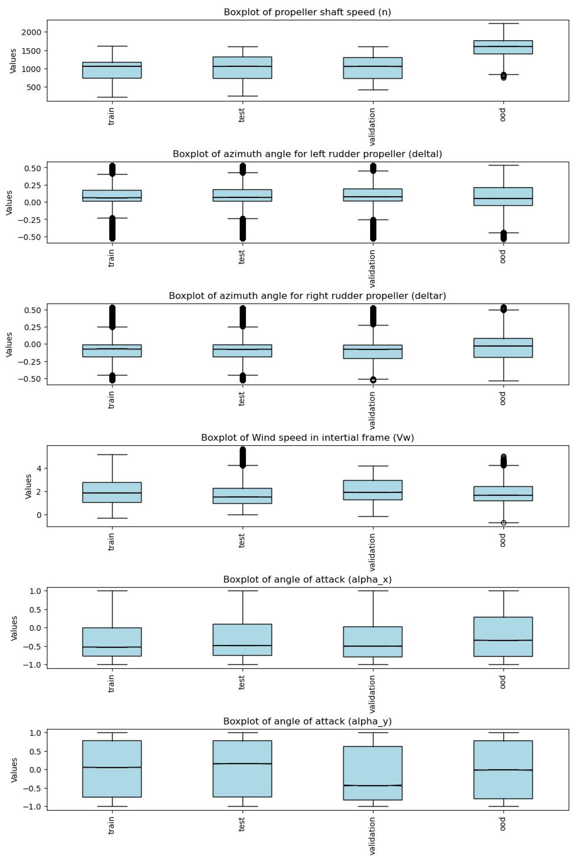 Regarding error dispersion, the standard deviation values within the in-distribution datasets (Train, Test, and Validation) remain within narrow ranges, indicating reproducible predictions with low variability under nominal operating conditions. By contrast, evaluation on the out-of-distribution (OOD) dataset reveals a clear increase in variance, most notably for and , reflecting reduced accuracy under extreme maneuvering scenarios. This aligns with the limitations of linear models, where generalization falters amid dominant nonlinear hydrodynamic effects.