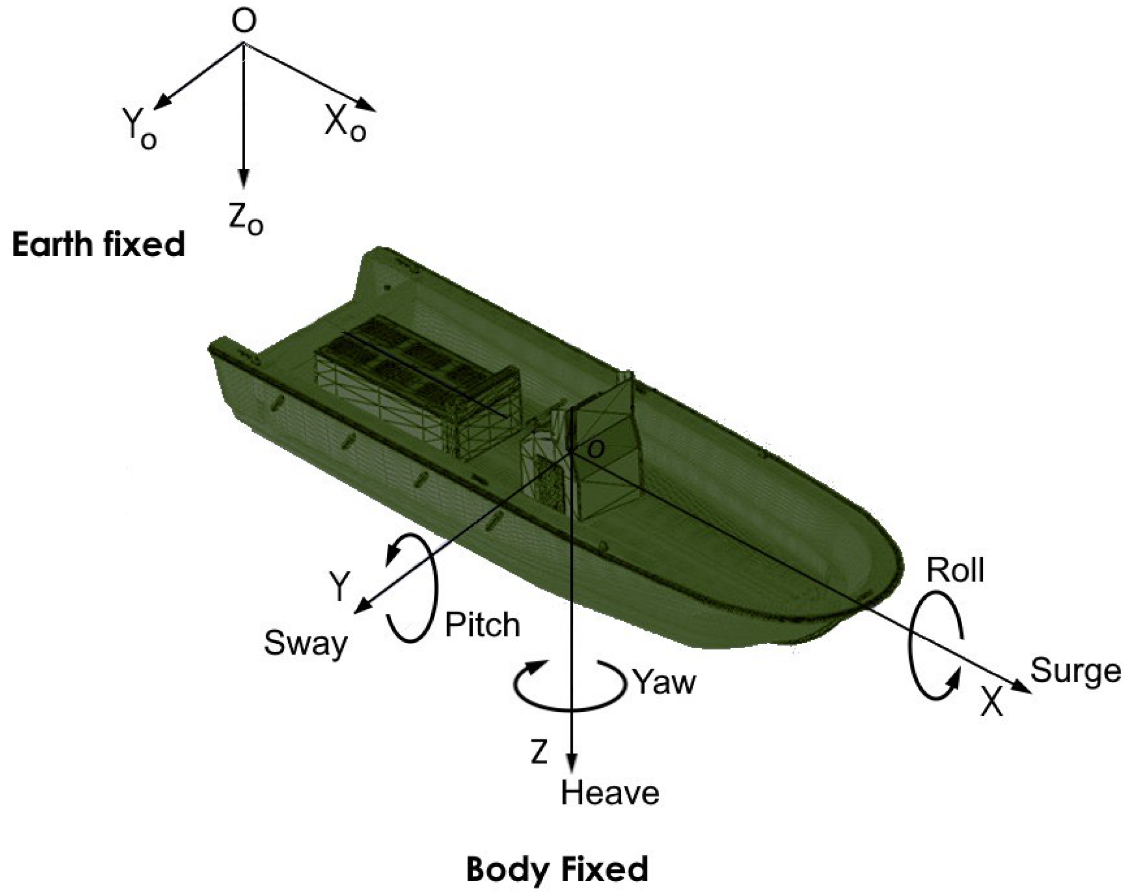 Figure 4 shows the six degrees of freedom of the vessel. The data set used to train the models was collected from random maneuvers in 4 degrees of freedom (surge, sway, roll rate, yaw rate, and roll angle).