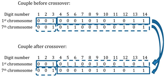 Below, Figure 1 illustrates the crossover at the 3rd digit (crossover site) between the 1st and 7th chromosomes. As an example, the 1st and 7th chromosomes were selected, and the crossover occurred at the 3rd digit of a 14-digit chromosome. As shown in Figure 1, the crossover involved splitting each 14-digit (bit) chromosome at the 3rd digit and swapping the resulting segments to create two new chromosomes.
