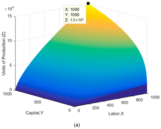 Plot of Cobb–Douglas function equation (2) in 0–1000 interval (a) without constraint (b) and with constraint Equation (3).