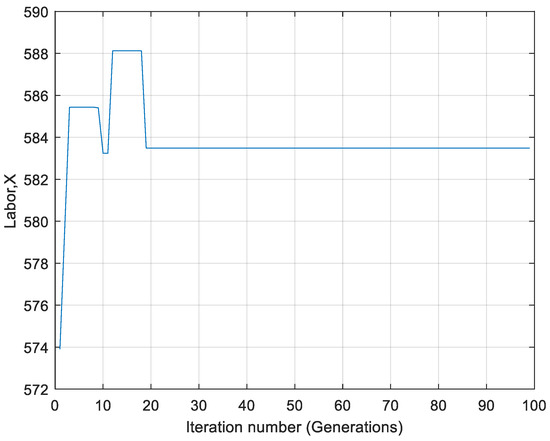 Figure 3 displays the convergence of the labor variable (x) towards the optimal value needed to maximize production under the specified constraints. The labor value converged to 583.33, consistent with the Lagrangian solution, within 20 iterations.