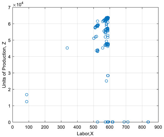 Figure 5 below presents the relationship between labor (x) and production units (z), highlighting the distribution of the genetic population or chromosomes. The population predominantly clusters around the labor value of 583.33, corresponding to the maximum production value identified by the GA. Zero values of Z, particularly for X-axis labor values exceeding 600, correspond to populations that failed the test under the constraint specified in Equation (3).