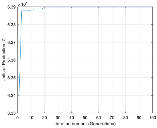 Figure 7 shows the convergence of the Cobb–Douglas function (z), representing the maximum units of production under the given constraints, reached a value of 63,895. This result matches the value obtained via the Lagrangian solution (traditional method), with convergence achieved in fewer than 20 iterations.