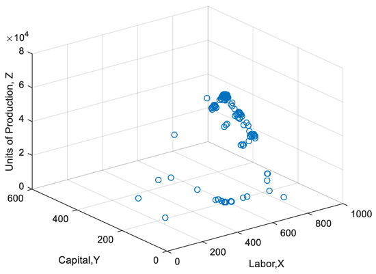 Figure 8 provides a three-dimensional representation of the genetic population with respect to labor (x), capital (y), and production units (z). The population predominantly accumulates around the maximum production value of 63,895, demonstrating the effectiveness of the GA in identifying the optimal solution.