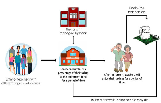 Teachers of all ages and salaries participate in the savings and retirement process by contributing a percentage of their pay into a retirement fund, which is subsequently increased over time by bank interest earned through a trust fund at a banking institution. Upon retirement, the accumulated funds will be disbursed to the teacher, allowing them to enjoy their retirement years (see Figure 1).