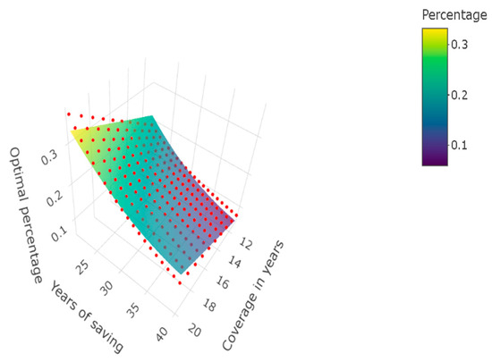 After further sensitivity analysis, we assume that the duration of the savings will vary from 21 to 40 and the coverage from 11 to 20 years. Figure 4 presents an image and contour plot generated with R version 4.3.1 software. The figure indicates that low contribution percentages (approximately 10%) correspond to savings of about 40 years and coverages of close to 12 years. In contrast, high percentages (around 33%) correspond to 20 years of savings and 20 years of coverage. Figure 5 depicts the contribution percentages in a three-dimensional scatter plot.