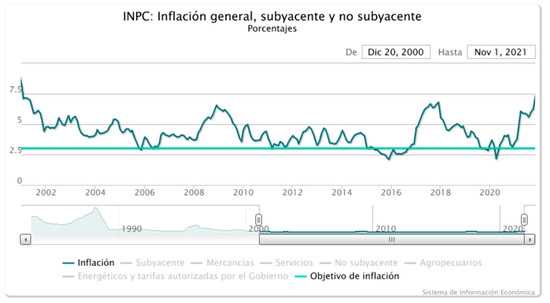 - Banxico. Inflation Portal. 2024. Available online: https://www.banxico.org.mx/tipcamb/main.do?page=inf&idioma=sp (accessed on 28 April 2024).