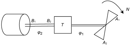 Gearbox T contains gears engaged in different ways, depending on the current rotation angle of the axis. Specifically, when the rotation angle is small, the teeth of the gears practically do not contact, and the transmitted torque is very small. When a certain threshold is exceeded, the teeth of the gears contact on the drive side, which results in the torque , where are the moments of inertia of the axes, and are their angular velocities of rotation. Provided that .