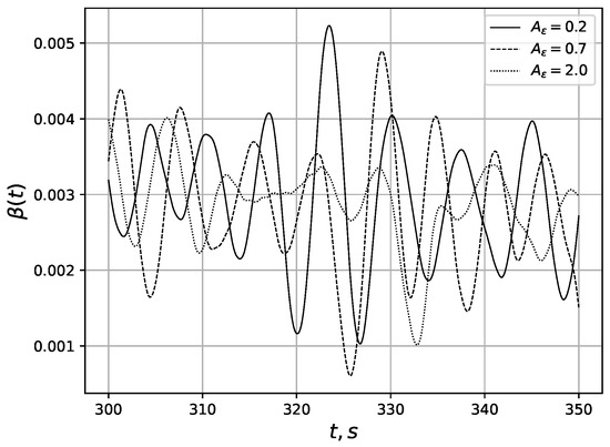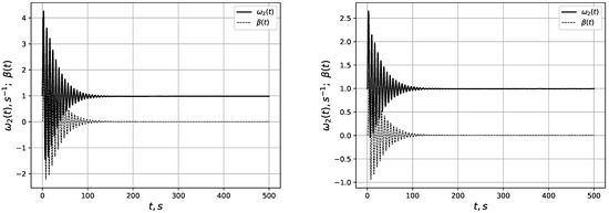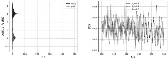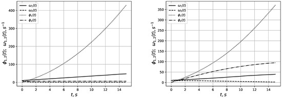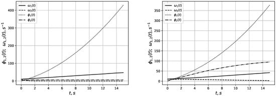 Figure 5 (left panel) presents the results of the numerical solution of the system (12) with a random for the following parameter values: , , , , , . In Figure 5 (right panel), , and the other parameters are the same. As compared to Figure 4, the behavior of the frequencies and is less regular, depending on time.