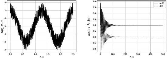 Figure 6 presents a graph of the wind torque and the graphs of functions and . The numerical calculations were performed for the following control parameters: , , , .