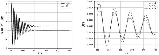 All the parameters in Figure 4 (right panel) are the same except for . In this case, the angular acceleration of the turbine is greater.