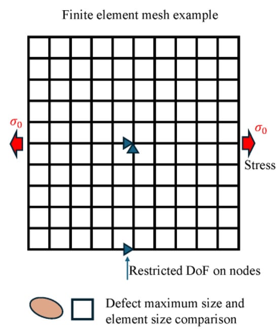 To study porosity, as shown in Figure 2, a reference model of with regular 2D square finite elements and an element size of has been used. is chosen such that the element size is of the order of the pore size, , ensuring no gaps appear. The plate is subjected to lateral tension and assumed to be in the elastic regime. The material selected is Ti-6Al-4V with a Young’s modulus of 113 GPa and a Poisson’s ratio of 0.3, to use the defect density per mm2 and statistical data (mean and standard deviation) for the size, shape, and orientation of pores [39]. From these data, a function generates the dimensions and orientation of the defect, assuming a normal distribution.