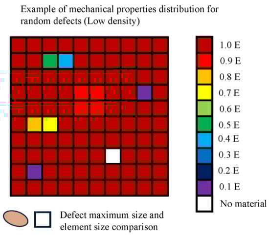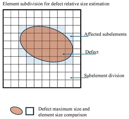 Practically, the defect is considered an ellipse where the aspect ratio is given by the defect’s shape factor (0 < < 1), so , where is the major axis and is the minor axis, and the area is that of the pore. The Young’s modulus of each element containing or affected by a pore is adjusted according to the ratio of the pore area affecting the element to the element area, reducing its mechanical properties proportionately (simplified to 10 values between 0% (element removal) and 100% of resistance (intact element), as shown in Figure 3). The pore shape differs from a square, so it can affect multiple elements. The element is therefore subdivided into smaller sub-elements with known areas, allowing numerical determination of whether they belong to the defined elliptical area of the pore. The number of subdivisions for each element is the square of the number of Young’s modulus divisions; in this case, 10 × 10 regular sub-elements, as seen in Figure 4.