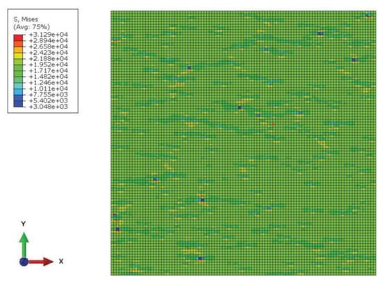 The study has been carried out using a software suite for finite element analysis (FEA) and computer-aided engineering, namely Dassault Systèmes [40], with linear quadrilateral plane stress elements to simulate the interior of the material. The von Mises-related stress field is shown in Figure 5. Because the statistical approach is not based on any real issue, it made little sense to perform a convergence study. The model must give an approximation to an unknown result, relying on the parameter variation of an approximation to the real microstructural behavior.
