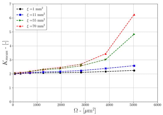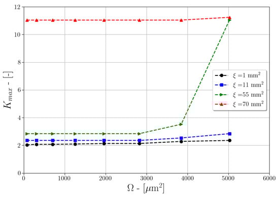 This section presents the findings of the numerical simulations. Figure 6 illustrates the maximum stress concentration factor () as a function of size defect Ω for the various pore concentrations ξ under consideration. The total area of the defect for all solid pores defines the defect concentration parameter. As illustrated in Figure 5, the maximum stress concentration factor increases with defect concentration, with this effect becoming more pronounced for a defect concentration of 70 mm2, even at lower area values. Furthermore, an increase in the size defect only affects when the defect concentration is 55 mm2. No significant variation in with area is observed for other defect concentrations. This analysis suggests that controlling defect concentration is a more critical factor than controlling defect size.
