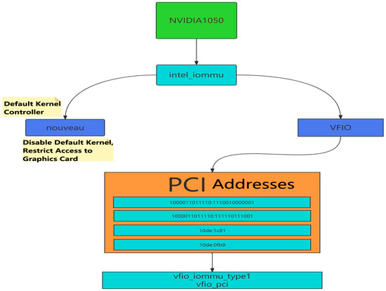 Through the above detailed design and optimization measures, the VGA/HDMI/DP video output and audio output functions based on the NVIDIA 1050 graphics card are realized, providing users with high-quality images and audio–visual experiences. However, during the deployment of the GPU pass-through technology, one may encounter issues such as hardware compatibility, BIOS settings, Linux kernel and driver versions, VFIO module loading, and OpenStack configuration. By carefully consulting official documentation, correctly configuring the BIOS, upgrading the Linux kernel and drivers, optimizing VFIO module loading, and properly configuring OpenStack, one can ensure the smooth deployment and use of GPU pass-through technology. The detailed design is illustrated in Figure 3.