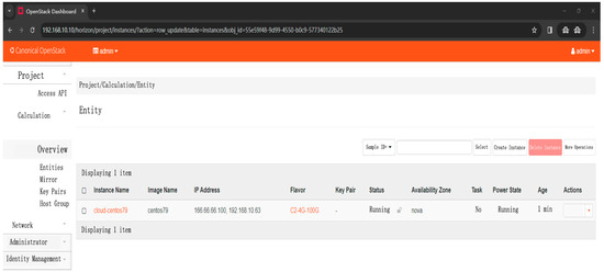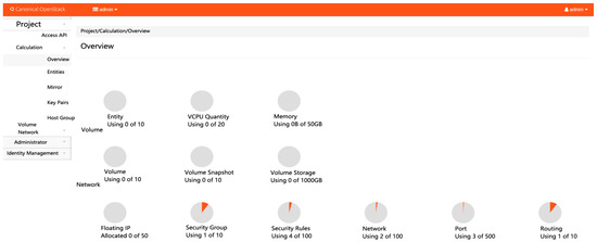 When the Dashboard in the OpenStack cloud platform supports real-time monitoring of the cloud platform’s health status, it is necessary to provide an intuitive and easy-to-use interface so that users can easily manage resources such as virtual machines, storage, networks, and security. The implementation of these functions depends on the APIs of the underlying components of OpenStack. Therefore, the Dashboard needs to be tightly integrated and compatible with these components. Moreover, the Dashboard should reasonably select and display these indicators so that users can quickly understand the overall status of the cloud platform. The display method of monitoring indicators also needs to be intuitive and easy to understand, avoiding information overload or being too complicated. The Dashboard implementation is shown in Figure 9.