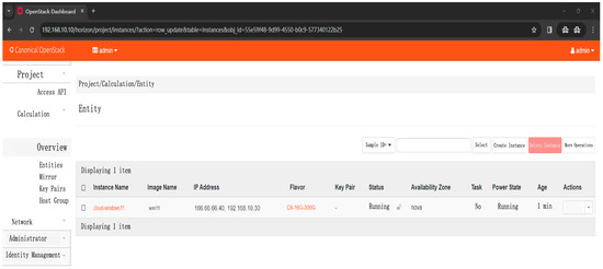 The cloud instance types of OpenStack have certain complexities and challenges in relation to aspects such as metadata setting, modification of boot types, setting the boot mode to UEFI, PCI pass-through of graphics cards, and the deployment and management of Windows 11 cloud instances. In order to address these challenges, a Windows 11 image suitable for OpenStack and UEFI boot was prepared, and specific drivers were selected to support pass-through devices and the OpenStack environment. At the same time, the Horizon management and monitoring tool was used to ensure the normal operation and performance optimization of the Windows 11 cloud instances (Figure 11). In addition, by using mature OpenStack distributions, reasonable planning and configuration, certified hardware and drivers, effective security strategies and management practices, and by adopting best practices and tools, these challenges can be effectively addressed and efficient cloud instance management can be achieved [32].