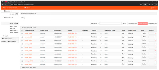 The availability of creating virtual machines on the cloud platform was tested, which involved invoking multiple key components such as Keystone, Glance, Placement, Nova, and Neutron during the bulk creation of virtual machines. Ten virtual machines were created and tested using the Cirros image to verify the normal operation of each component. The test also included checking whether the network topology was properly connected to ensure that the virtual machines can access the internet smoothly. This series of tests will provide assurance for the stability and reliability of the cloud platform. Through thorough testing, it was ensured that the cloud platform met the requirements of various practical application scenarios and provided users with stable and reliable services, as shown in Figure 13.