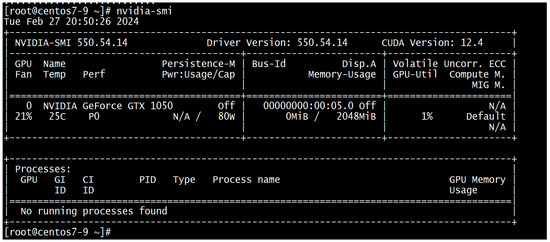 In a cloud platform environment, it is a challenge to correctly identify the devices that need to be passed through. In the Linux system, use the lspci tool to view the detailed information of the server’s devices, and, in the CentOS 7 system, use the “lspci-nn” command to accurately obtain the hexadecimal code of the device that needs to be passed through (pass-through), and, at the same time, record these hexadecimal forms of the manufacturer ID and device ID, which provides the necessary basic information for realizing device pass-through [31]. The GPU pass-through to the CentOS cloud host is shown in Figure 10.