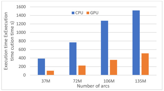 As the number of arcs increases from 37 M to 135 M, the execution time on both the CPU and GPU increases. However, the rate of increase is more pronounced for the CPU, suggesting that the complexity of the problem disproportionately affects CPU performance compared to the GPU. For example, the CPU execution time at 135 M arcs is the highest (Figure 4), indicating that handling larger datasets significantly burdens CPU resources.