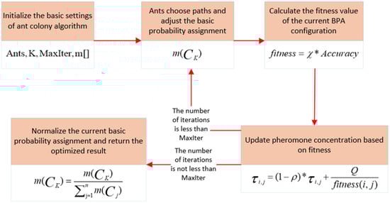 This means that the sum of the basic probability distribution of all events equals 1, that is, all hypotheses are complementary, and there is always one hypothesis that is true. Therefore, the sum of the degrees of confidence assigned to all propositions should be equal to 1. In this paper, the basic probability assignment will subsequently be determined by the Ant Colony Optimization algorithm.